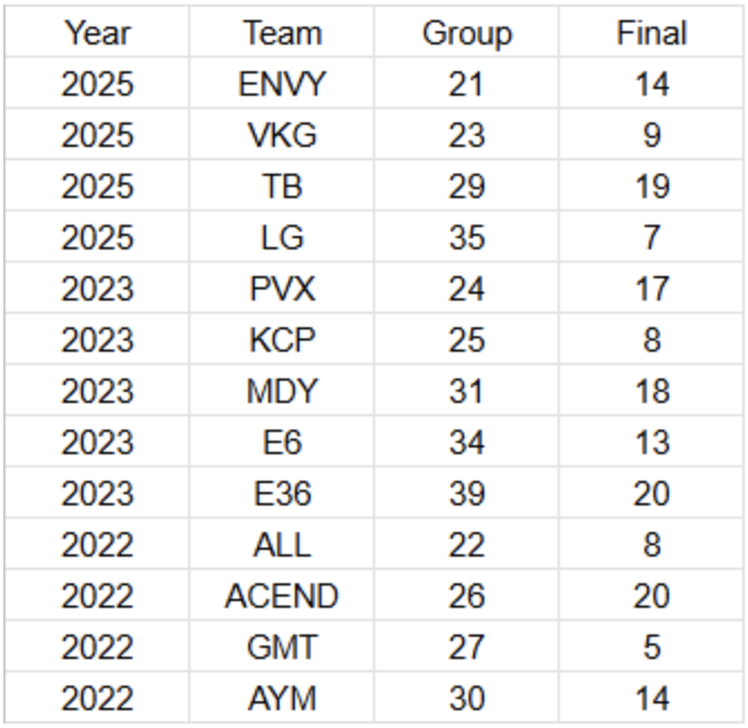 Group Stageでの順位に目を向けると、多くは20位台、即ちLosersの中での上位チームが多いようだ。ただE36(2023)などは39位(下から2番目)からのFinal進出を果たしているし、先ほど取り上げたLG(2025)も35位からFinalでは7位の下剋上を達成している。
