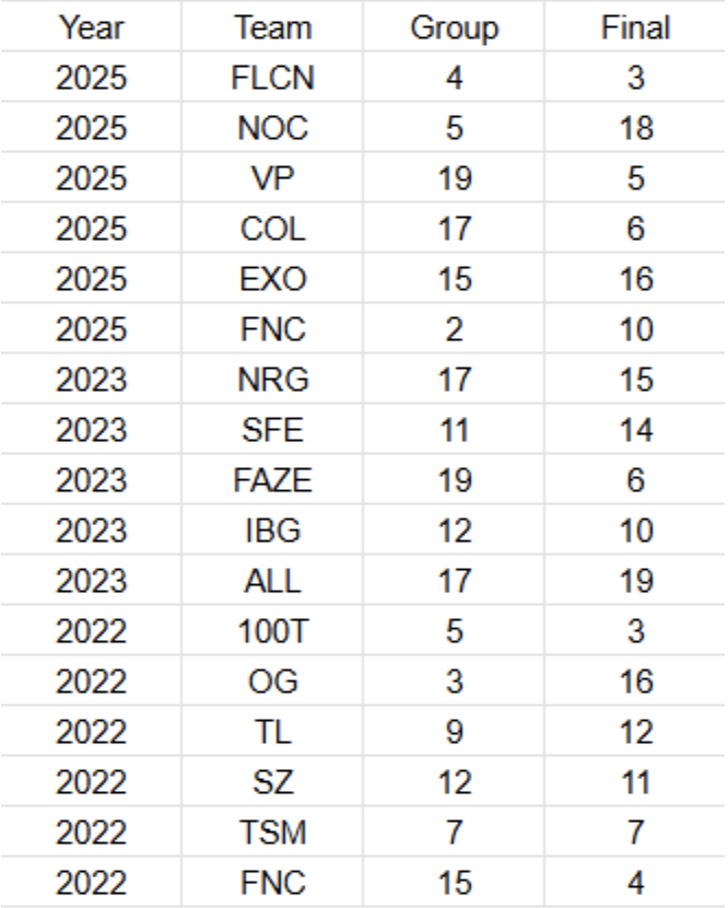 上の表を見ると、Finalでの順位はGnaske,SirDel,RambeauらGMT(2022)が取った5位が最高で、世界トップレベルのIGLだったSweetdreamsがFuhhnq,Sikezzの高火力2名を率いていたLG(2025)が7位で続いている。